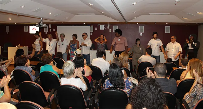 Em seguida, o grupo de teatro da Real Grandeza entrou em cena apresentando o espetáculo “O Gabinete”, que já foi visto por mais de 5 mil pessoas em empresas, escolas e comunidades. A peça aborda diversos tipos de preconceitos, como discriminações por gênero, raça, opção sexual, preconceitos contra pessoas com deficiência, assédio sexual, assédio moral, intolerância religiosa e violência doméstica.