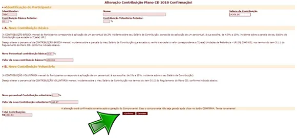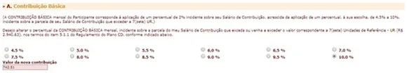 - Logo abaixo estão disponíveis os percentuais de Contribuição Básica que os participantes poderão escolher, assim como a confirmação do novo valor, conforme imagem abaixo.