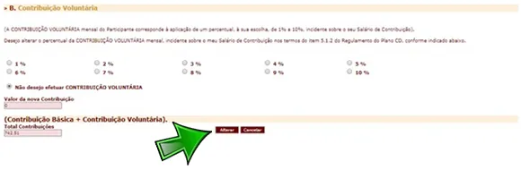 - Em seguida é possível definir novo percentual de Contribuição Voluntária, com a confirmação do valor desse aporte e do total das contribuições (Básica + Voluntária). Confira as novas opções selecionadas e clique em Alterar, conforme informado a seguir.