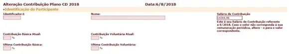 - Na página de alteração do percentual, serão exibidas as informações de Identificação do Participante, como nome, ID FRG e percentuais de contribuição Básica e Voluntária atuais.