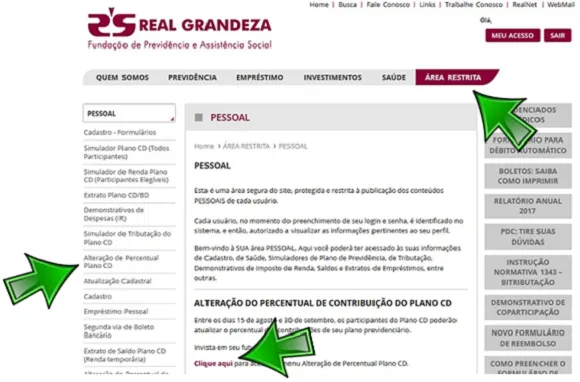 - Conforme imagem abaixo, acesse o menu "Área Restrita/Pessoal" e, em seguida, na opção "Alteração de Percentual Plano CD” (localizado na lateral esquerda do site ou na matéria no centro da página);