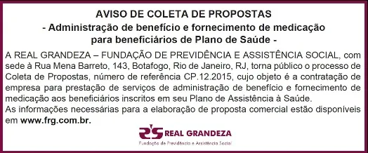 A REAL GRANDEZA – FUNDAÇÃO DE PREVIDÊNCIA E ASSISTÊNCIA SOCIAL, com sede à Rua Mena Barreto, 143, Botafogo, Rio de Janeiro, RJ, torna público o processo de