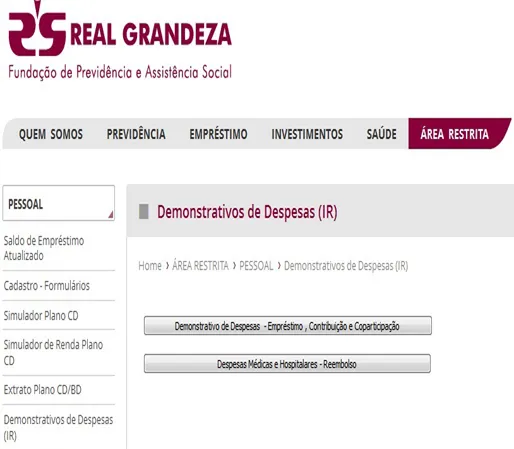 • No menu superior do site, na seção ÁREA RESTRITA, selecione o link PESSOAL e, em seguida, no menu lateral à esquerda, clique em DEMONSTRATIVOS DE DESPESAS (IR). Uma nova tela irá se abrir com duas opções:
