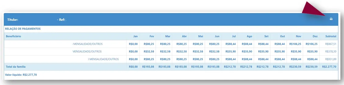 Na tela seguinte os valores já serão exibidos. Para gerar um arquivo .PDF ou imprimir, clique no ícone impressora, localizado do lado direito.