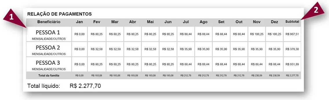 1 - Informação do beneficiário e CPF. Também nesta coluna estarão informados, separadamente, os valores pagos de mensalidade e de coparticipação.