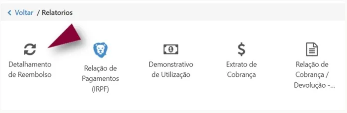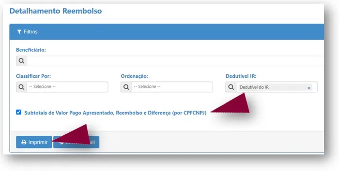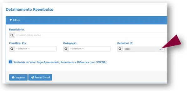Para gerar o relatório com informações de reembolso, selecione a opção Detalhamento de Reembolso.