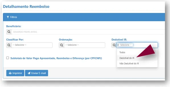 - Na última coluna está informada a diferença, ou seja, a parte não reembolsada e que ser utilizada para dedução do IR. É importante lembrar que no sistema gerador do IR são digitados os valores pagos e reembolsados, com a diferença sendo calculada pelo sistema.