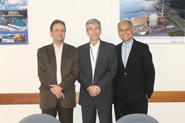 O novo diretor de Administração, Paulo Fonseca Soares (ao centro), é recebido pelo diretor-presidente Sérgio Wilson Ferraz e pelo presidente do Conselho Deliberativo, Marcus Vinícius Vaz.