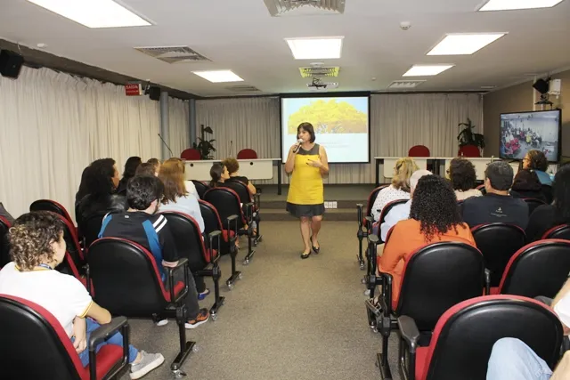 A psicóloga Ana Café em palestra no auditório de Furnas