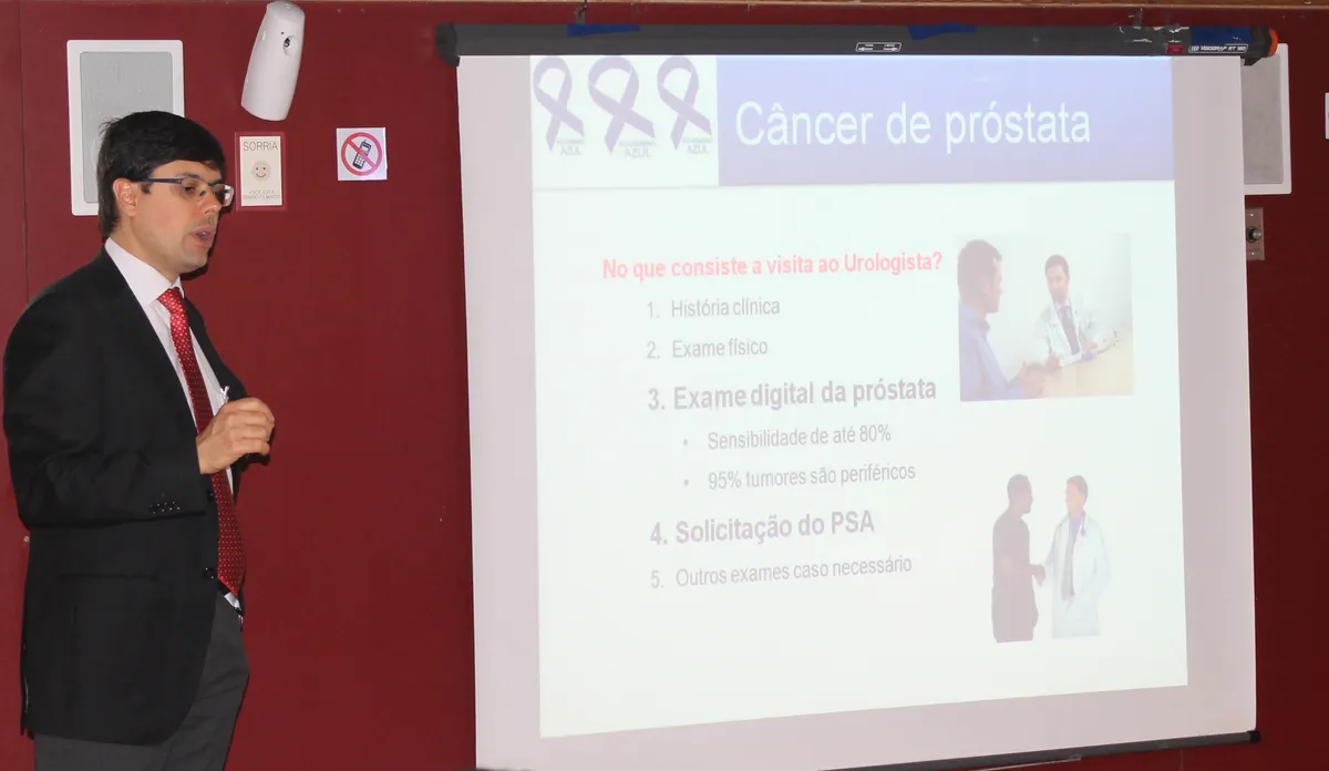 O urologista Renato Faria em palestra no auditório da Real Grandeza
