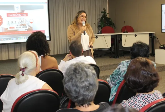 A cardiologista Ellen Barroso durante palestra sobre o combate ao colesterol no auditório de Furnas