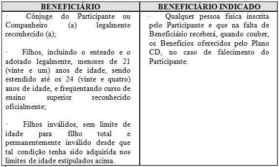 A inscrição dos beneficiários poderá ser alterada, a qualquer tempo, mediante comunicação formal do Participante à REAL GRANDEZA, através do preenchimento de um formulário de Atualização de Beneficiários do Plano CD juntamente com Declaração de Dados Cadastrais – DDC desses novos beneficiários. A existência de BENEFICIÁRIO LEGAL implica a conseqüente exclusão de qualquer BENEFICIÁRIO INDICADO para fins de recebimento dos BENEFÍCIOS oferecidos pelo PLANO CD. É importante manter esses dados atualizados nos casos de nascimento de filhos, alteração do estado civil e falecimento desses beneficiários. |